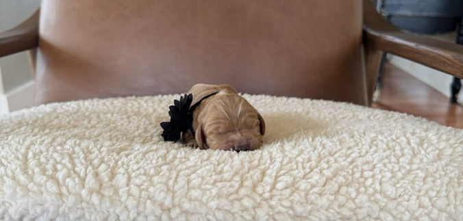 A sweet and steady puppy with an affectionate nature and an easygoing presence, this Australian Labradoodle is the kind of companion who enjoys being close to his people and settling comfortably into family life. He has a calm, gentle temperament and a warm personality that makes him easy to love and wonderful to have around. Expected to mature around 30–35 lbs, he should have a soft, low-shedding fleece coat and a balanced personality well suited for families looking for a friendly, relaxed companion.