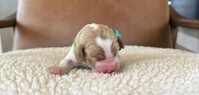 Clover is a stunning male Australian Labradoodle puppy with a beautiful parti-colored coat and a sweet, social personality. He carries the distinctive markings passed down from his dam Molly and the gentle, polite nature of his sire Gunnar, making him truly one of a kind. Clover has a cheerful, curious spirit and loves being part of the action, always eager to explore and connect. His eye-catching coat and warm temperament make him a pup who draws admiration wherever he goes, and he'll quickly become a beloved part of the family.